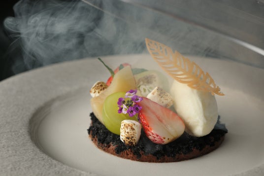 チョコレートムースと竹炭クランブルの上に季節のフルーツとマシュマロを乗せた、キャンプの定番であるスモアを表現したデザートです。仕上げにスモークを閉じ込めて、テーブルで蓋を開けた瞬間に広がるスモーキーな香りとアイスクリームのマリアージュも楽しめます。