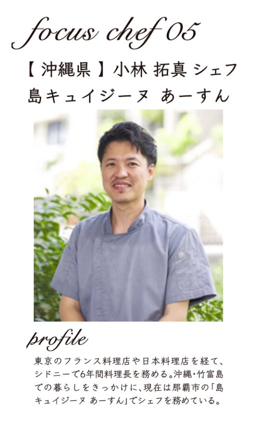 守られ、文化が残る」という、食材と人とのつながりの力強さを教えてくれます。 命を感じながら、島の食文化を料理を通して表現していきたいと思っております。