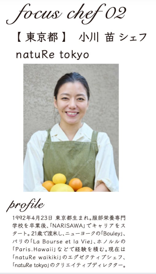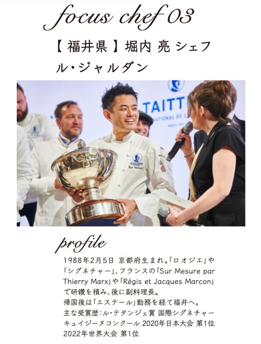 フォーカスシェフとは、「自身のコンセプトを確立し、表現していること」「地元食材や和食材の魅力を積極的に発信していること」「未来の星つきシェフ候補」などを基準に選んだ、今注目すべき魅力的なシェフ達です。また、サステナブルな活動や日本の豊かな食材を育み食文化を支えるシェフ一押しの生産者の方々にもぜひご注目ください。