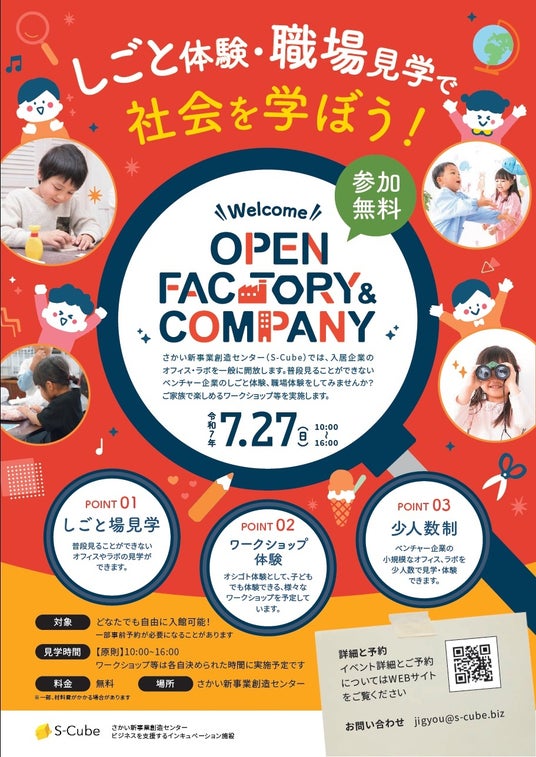 S-Cube職場見学・仕事体験こども向け夏休みイベント「オープンファクトリー」を行います