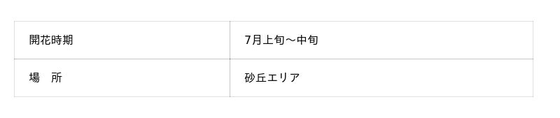国営ひたち海浜公園の「砂丘エリア」では、スカシユリが咲き始めました。花言葉「注目を浴びる」の通り、鮮やかなオレンジ色の花がひときわ目を引きます。強い日差しと潮風の中で力強く咲く姿から、"砂丘の女王"とも称されます。また、夏の砂丘エリアでは、絶滅や準絶滅が危惧される希少な動植物にも出会えます。