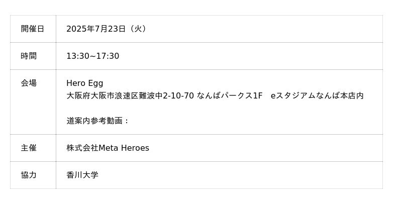 株式会社Meta Heroes(本社所在地:大阪府大阪市、代表取締役:松石和俊、以下「当社」)は、2025年7月23日(火)、DX教育スペース「Hero Egg」(大阪府大阪市 なんばパークス)にて、参加型防災教育イベント「こども防災万博mini」を開催いたします。