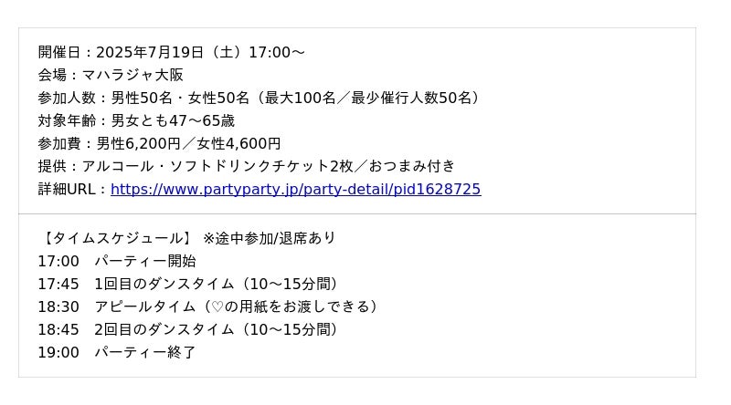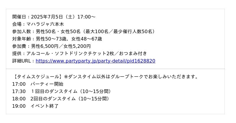これまでに関西で2回、関東で1回実施したマハラジャでのディスコ婚活パーティーは、いずれも満席・高評価を得るなど好評を博しました。その反響を受け、2025年7月に東京・大阪の2都市で「ディスコ婚活パーティー」を開催します。青春時代を思い出しながら、心躍る出会いをお楽しみいただける特別なイベントです。