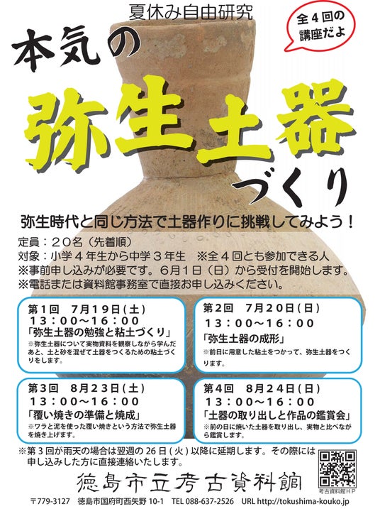 【徳島市】 徳島市立考古資料館 夏休み自由研究「本気の弥生土器づくり」参加者募集!