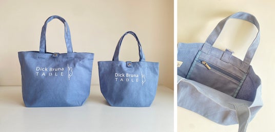 定番人気のロゴ帆布トートバッグに大人かわいい新色のニュアンスブルーが新登場します。ちょっとしたお出かけやランチバッグにも使える待望の小さめSサイズも同時新発売です。Mサイズは中にはファスナー式の吊りポケットとワインボトルも入れられるボトルホルダー付き、Sサイズにも中にMサイズ同様の吊りポケットが付いています。(M:横約42cm、縦約29cm、まち幅約13.5cm S:横約34cm、縦約24cm、まち幅約14cm ※「ディック・ブルーナ テーブル 神戸」でも販売します。)