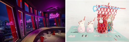 展望3階回転カフェ&バー(画像左 (C) 鈴木文人)のメニューに、予約いただいた方限定の「ミッフィーのプリントボトルに入ったいちごプリンとカラフルソーダ」(画像右)が登場します。※右画像はイメージです。
