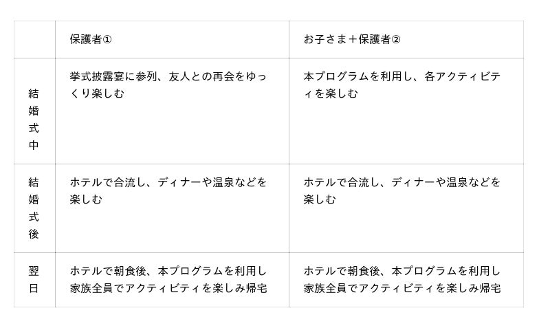 (例)1泊2日で保護者1.は結婚式に参列し、お子さまと保護者2.はアクティビティを楽しむ