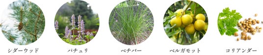 トリ(カプリル酸/カプリン酸)グリセリル、オオアザミ種子油、チャ葉エキス、ヒマラヤスギ木油、レモン果皮油、ベルガモット果皮油、マンダリンオレンジ果皮油、ベチベル根油、ライム果皮油、セイヨウネズ果実油、パチョリ葉油、シベリアモミ油、ペルーバルサム油、カナダトウヒ枝/葉油、シスツスラダニフェルス葉/茎エキス 、コショウ果実油、イタリアイトスギ葉油、コリアンダー種子油、バクチオール、ショウガ根油