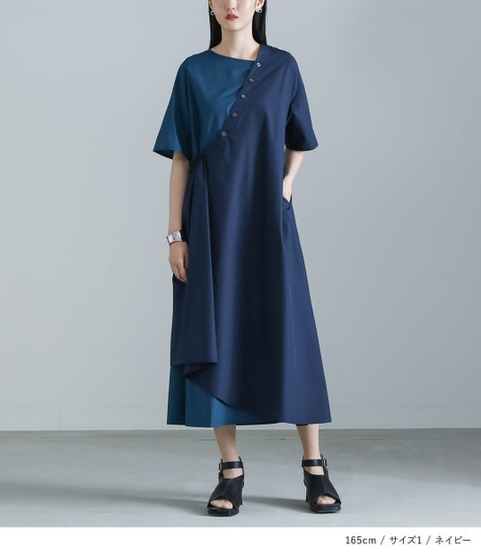 斜めに配置されたボタンデザインがユニークな前あきスタイルを作り出し、スカート部分もアシンメトリーなカッティングで個性を際立たせています。