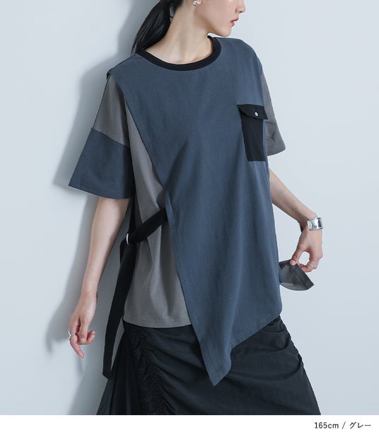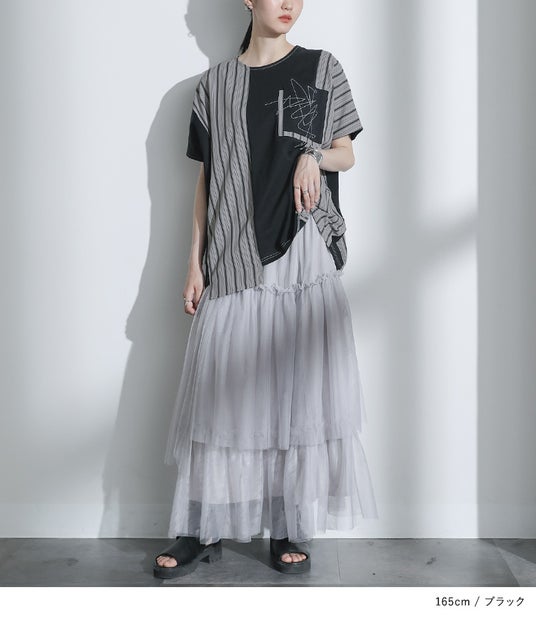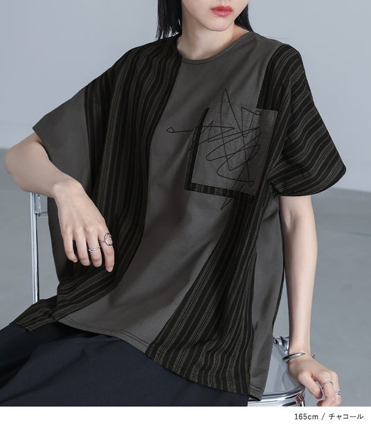 天竺カットソーと布帛ストライプをアシンメトリーに切り替えたドルマンカットソー。