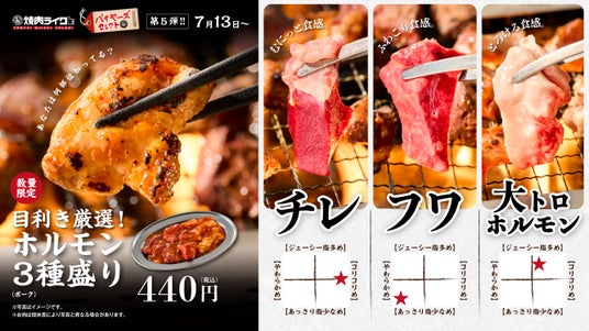 株式会社焼肉ライク(本社:東京都渋谷区、代表取締役:高橋尚也)が展開する「焼肉ライク」では、2025年7月13日(日)より、"フワ・チレ・大トロ"の3種をひと皿で楽しめる「ホルモン3種盛り」を数量限定で販売いたします。