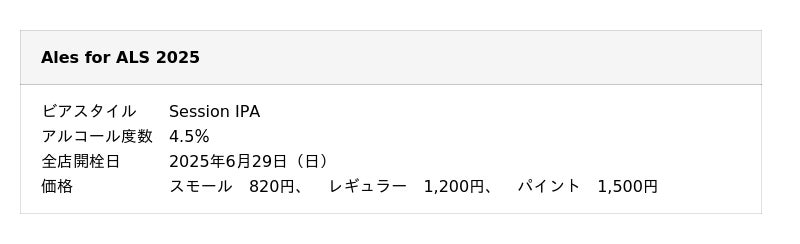 「Ales for ALS 2025」は、ALS支援と、クラフトビールの楽しみを同時に叶える、特別なセッションIPAです。今年の「Ales for ALS 2025」も、多くの方々に楽しんでいただき、ALS 患者さんへの支援活動に繋げていきたいと考えております。