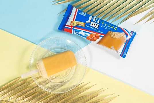 【内容】森永「塩キャラメル」をイメージしたバーアイスです。ロレーヌ産岩塩を使用した塩キャラメルアイスに、キャラメルチョコをコーティングしたシンプルな仕立てです。