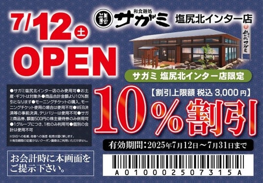 株式会社サガミホールディングスのグループ企業であるサガミレストランツ株式会社(本社:愛知県名古屋市守山区八剣二丁目118番地 代表取締役社長 鷲津 年春)は、2025年7月12日(土)に、「和食麺処サガミ塩尻北インター店」をグランドオープンいたします。