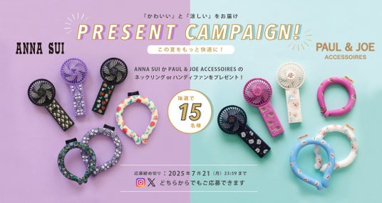 1879年(明治12年)創業のブルーミング中西株式会社(本社:東京都中央区、取締役社長:中西一)では、ANNA SUI、PAUL & JOE ACCESSOIRESの2ブランドから販売中のネックリングorハンディファンが当たるSNSキャンペーンを開催中です。