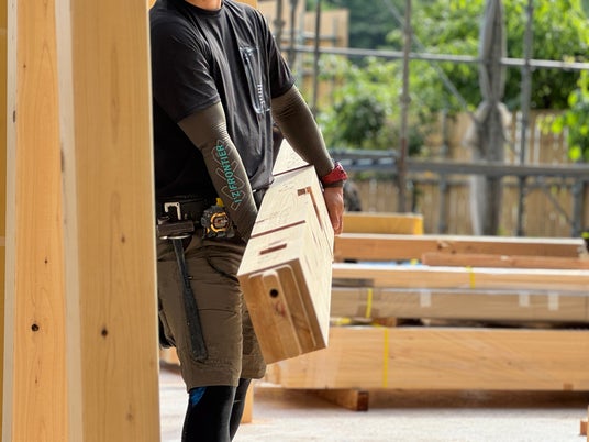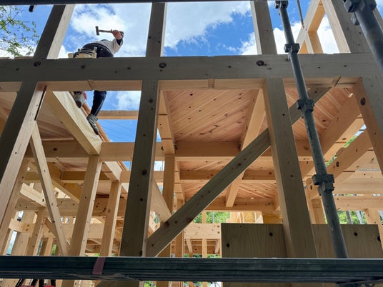 このヴィラは単なる宿泊施設に留まらず、岐阜県の地域資源を全国、そして世界に発信するモデルケースでもあります。柱と梁に用いる重ね材には、湿式・乾式の両技術を併用。すでに国の大臣認定を受けた重ね材(湿式)に加え、乾式工法も試験段階にあり、建築分野での実用性が期待されています。