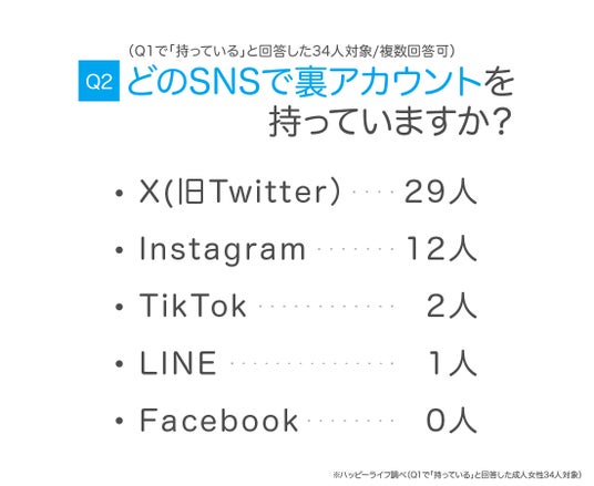 裏アカウントを持っている成人女性34人のうち29人が、X(旧Twitter)で裏アカウントを所持しているようです。