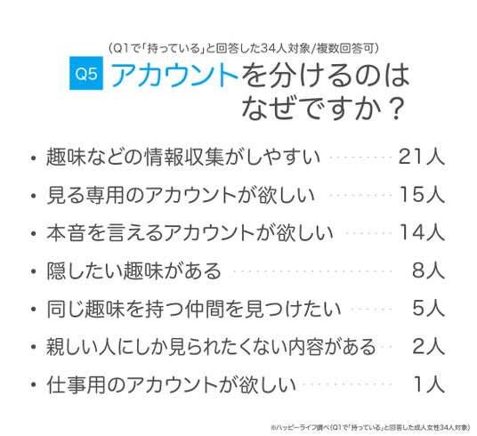 裏アカウントを持っている成人女性34人のうち、半数以上が「閲覧用」と回答しています。