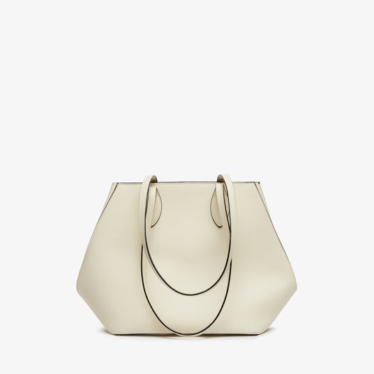 サイドを内側に折り込んだコンパクトな状態では、よりミニマルなデザインに。スナップボタンの付いたストラップで留めることで、コンパクトな状態をキープできます。サイドのレザー部分を外側に折ると容量が増え、直線的な美しいシルエットが広がります。素材はしなやかな手触りと、丸いシボが特徴のミレプンテ ソフトレザーを使用。開閉部は中央のマグネットフラップでスマートに。ストラップは肩掛けするのに最適な長さ。内側には上品なグレーのスエードライニングを使用し、取り外し可能なジップ付きポーチも備えています。