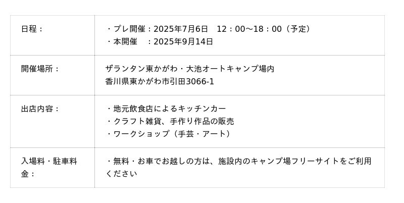 全国6カ所の地方地域でグランピング施設「ザランタン」をはじめとする宿泊施設を運営する株式会社ダイブ(東京都新宿区 代表取締役社長:庄子潔、証券コード 151A)は、香川県東かがわ市で運営するグランピング施設「ザランタン東かがわ」にて、地域と連携したマルシェイベント「ザランタン東かがわマルシェ」のプレ開催を2025年7月6日に実施いたします。