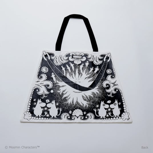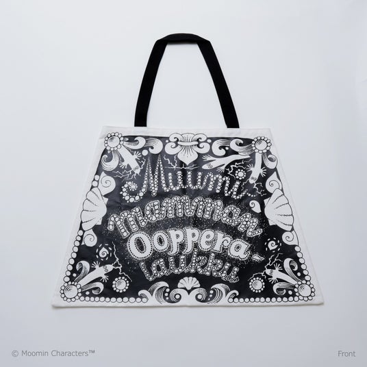 「ムーミン・オペラ」のパンフレットを大ぶりのトートバッグに。ムーミンママのハンドバッグを模した台形がポイントで、裏面にはニョロニョロやムーミントロールらしきキャラクターの姿も見えます。