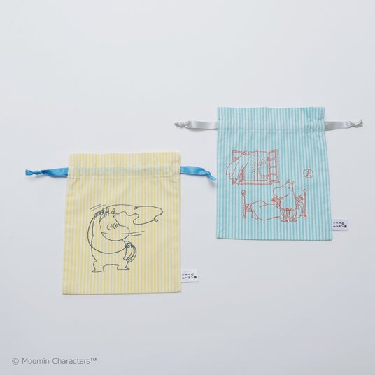 ストライプのダンガリー生地にトーベの線画をあしらった巾着。生地も柔らかく、コスメや日用品などを入れるのにちょうど良い大きさです。