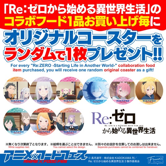 「Re:ゼロから始める異世界生活」のコラボフードを1点ご購入の度にオリジナルコースターを1枚プレゼントいたします。