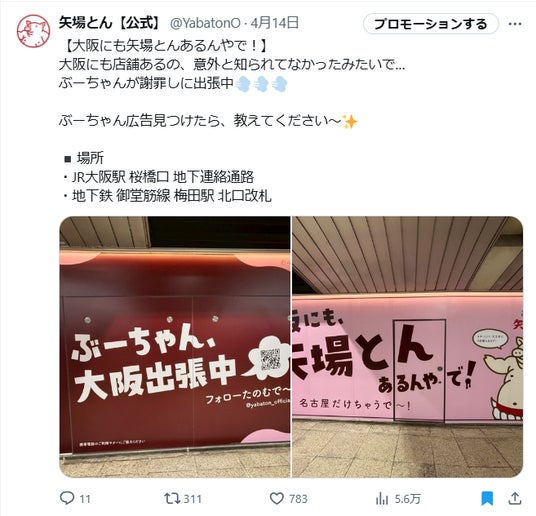 名古屋名物「みそかつ」の専門店、株式会社矢場とん(本社:愛知県名古屋市)は、今年4月に大阪で掲出した巨大看板がSNSで大きな反響を呼んだことを受け、皆様への感謝を込めて「大阪にも、矢場とんあるんやで!ステッカー プレゼントキャンペーン」を2025年7月7日(月)より大阪店舗限定で開催いたします。今年4月、「JR大阪駅桜橋アベニュー」および「Osaka Metro梅田アドストリート」に掲出した「巨大ビジュアル」に対し、SNS上で多くの温かいお声をいただき、誠にありがとうございました。その大反響への感謝の気持ちを込めて、皆様の声にお応えし、あの広告が"クーポンにもなる"ステッカーとして登場します。