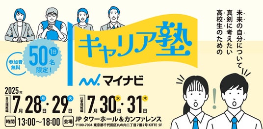 株式会社マイナビ(本社:東京都千代田区、代表取締役 社長執行役員:土屋芳明、以下マイナビ)が運営する進路情報サイト『マイナビ進学』(URL:https://shingaku.mynavi.jp/)は、高校生を対象としたキャリア教育イベント『マイナビキャリア塾』を2025年7月28日(月)~31日(木)の4日間、JPタワーホール&カンファレンスにて初めて開催します。