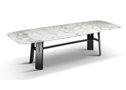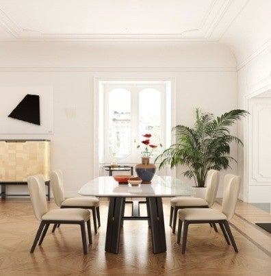 ミニマルで洗練されたデザインが際立つダイニングテーブル。クリーンなラインが、本質的な美しさとエレガンスを引き立てます。脚部にはソリッドアッシュ材を使用。傾斜をつけた丸みのある板材を、十字型の真鍮パーツで接合した構造が、力強い存在感と安定感を生み出しています。大理石の天板との組み合わせが、空間にさらなる上質さを添えます。