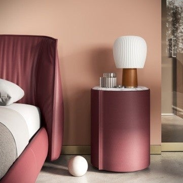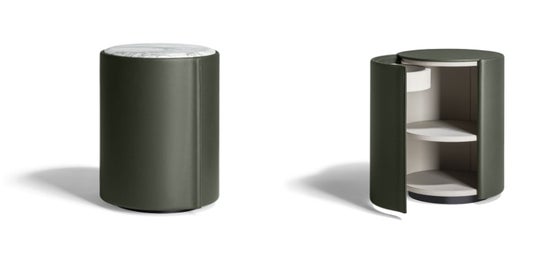 エレガントなカーブを描く扉と、異素材の組み合わせが生み出すコントラストが、空間に洗練された個性を添えます。本体の側面にはPelle Frau(R)レザーを、天板には光沢を抑えた上質な大理石または同レザーを採用しており、空間の雰囲気や好みに応じて選択いただけます。円筒のフォルムに、わずかにずらしたカバーの縁が取手のような役割を果たし、思わず手を伸ばしたくなるデザインです。軽やかな動作で開閉できる扉の内側には、小さなトレイと実用性の高い収納スペースが隠されています。