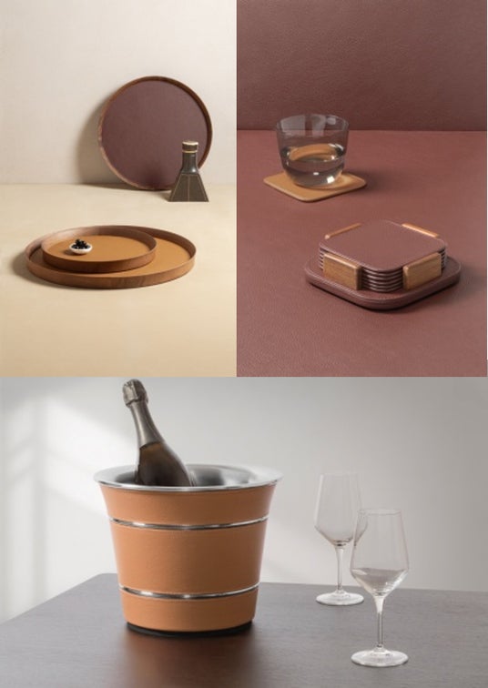 レザーホームアクセサリーブランド「Giobagnara」とのコラボレーションから生まれた「テーブルウェアコレクション」は、ダイニングシーンに洗練された華やぎを添えるアクセサリーシリーズです。Pelle Frau(R)レザーを贅沢に用い、細部に至るまで丁寧に手作業で仕立てられたアイテムは、エレガントで実用性にも優れ、ささやかな食卓も特別なひとときへと昇華させます。