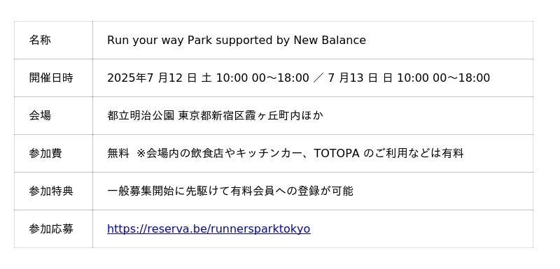 本ランニングコミュニティ発足にあたり、オープニングイベント「Runner's Park Tokyo Run your way Park」(以下「本イベント」)を2025年7月12日(土)、13日(日)に都立明治公園にて開催します。本イベントでは、本ランニングコミュニティのプログラムを無料で体験できるだけでなく、その日限りのスペシャルなコンテンツも用意しています。