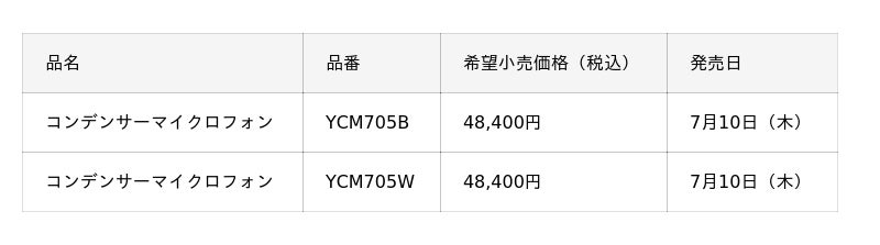 ヤマハ株式会社は、楽曲制作を中心にライブ配信や映像コンテンツ制作にも最適なコンデンサーマイクロフォン『YCM705』を2025年7月10日(木)に発売します。