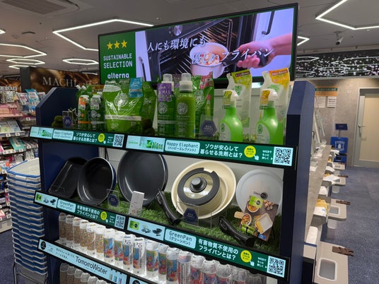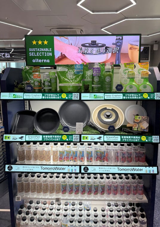 同店の商品陳列棚の一部で、株式会社オルタナが選定する環境・社会に配慮した製品・サービスである「サステナブル★セレクション」商品として、ベルギーのクックウェアブランド、グリーンパンの見本を展示しています。商品販売は店頭で行わず、デジタルサイネージに表示されるQRコードをスマートフォン等で読み込んでいただくことで、ECサイトから商品を購入いただけます。