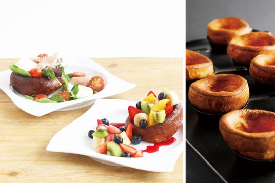 アトリエテラスのポップオーバーは朝霧高原の放し飼い卵「福が、きた」、朝霧高原産「あさぎりバター」を使用し、ふんわり膨らむまでひとつひとつ丁寧に焼き上げます。トッピングは、旬のフルーツを使った"甘味"と、地元野菜を活かした"おかず系"の2種類をご用意。素材の魅力を引き立てた、それぞれの味わいをお楽しみいただけます。