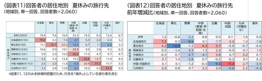 居住地別に旅行先を見ると、旅行先と居住地が同じ地方である域内旅行の割合は、「北海道(70.2%)」、「九州(52.5%)」の2地域で50%を超えています。一方、関東地方の居住者では旅行先が「関東」となっているのが19.1%であるのに対し、「中部」は28.8%と居住地域を上回っています (図表11)。前年と比較すると、「北海道」、「中国・四国」、「九州」では域内旅行の割合は増加しました。一方「東北」居住者において、域内旅行が12.8ポイント減少し、旅行先は「中部」、「近畿」、「北海道」が増加しました(図表12)。