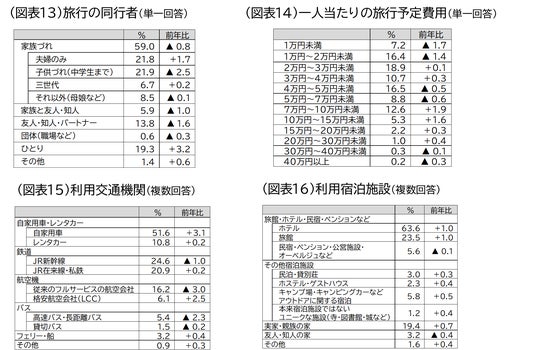 同行者:「子供づれ(中学生まで)の家族旅行(21.9%)」が最も多く、次いで「夫婦のみ(21.8%)」、「ひとり(19.3%)」の順となりました。前年からの増減に注目すると、「ひとり」と「夫婦のみ」が増加し、「友人・知人・パートナー(13.8%)」、「家族と友人・知人(5.9%)」は、減少しました。大人数で家族以外の親しい人との旅行が増えていた前年と比べ、今年は少人数の旅行が増える様子がうかがえます(図表13)。