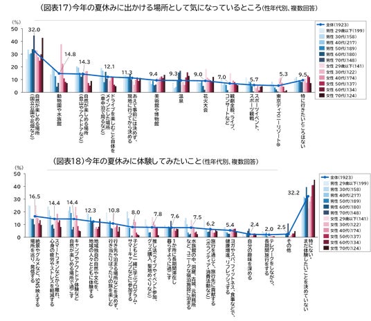 出かける場所として気になっているところは、「自然が楽しめる場所(国立公園や花畑など)(32.0%)」、次いで「動物園や水族館(14.8%)」となりました。性年代別に見ると「自然が楽しめる場所(登山やアウトドアなど)」は男性30代が高く(20.3%)、花火大会は女性29歳以下が高い(18.4%)など、夏の楽しみ方に性年代別の特徴が表れています(図表17)。