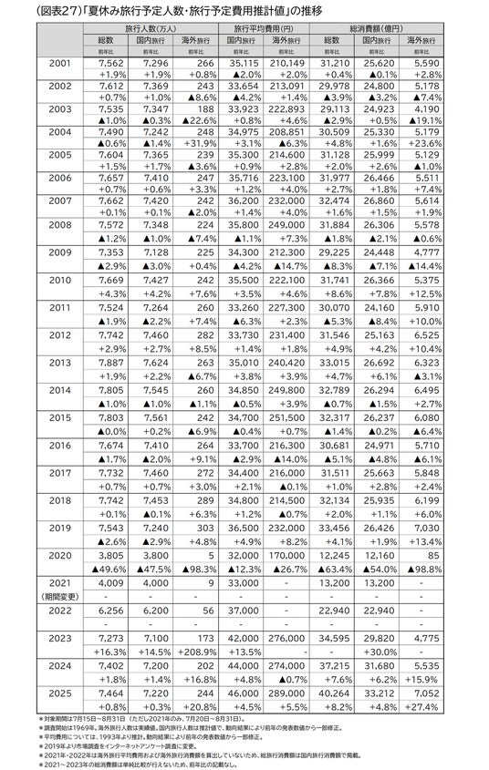 JTBは、「夏休み(2025年7月15日~8月31日)に1泊以上の旅行に出かける人」の旅行動向見通しをまとめました。本レポートは、1泊以上の日本人の旅行について、各種経済動向や消費者行動調査、運輸・観光関連データ、JTBグループが実施したアンケート調査などから推計したもので、1969年から継続的に調査を実施しています。