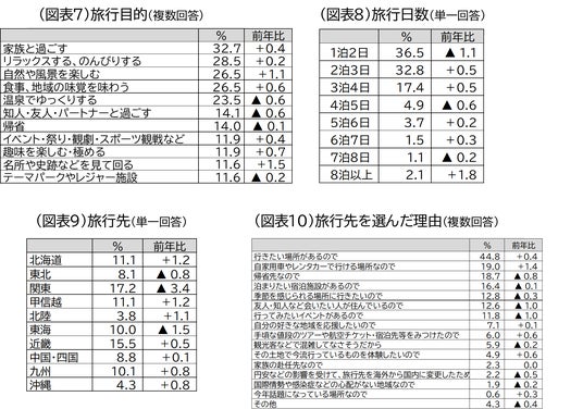 旅行先:「関東(17.2%)」が最も多く、次いで「近畿(15.5%)」、「北海道(11.1%)」、「甲信越(11.1%)」となりました。伸び率でみると、「北海道」、「甲信越」ともに1.2ポイントの増加、「北陸(3.8%)」は1.1ポイントの増加、「九州(10.1%)」と「沖縄(4.3%)」もそれぞれ0.8ポイント増加しました(図表9)。