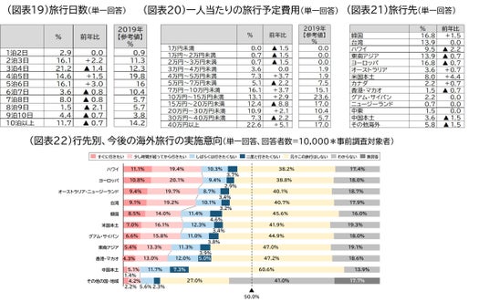 - 海外旅行は、旅行者数が244万人(対前年120.8%)、平均旅行予定費用は289,000円(同105.5%)、旅行消費額が7,052億円(同127.4%)