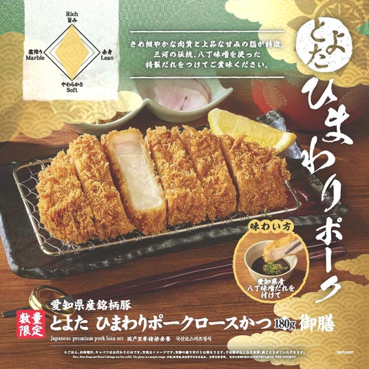さぼてんが自信を持ってお届けする国産銘柄豚シリーズ。今回は、愛知県から「とよた ひまわりポークロースかつ御膳」が初登場します。豊田市の花である「ひまわり」の種を含んだ飼料で育ち、やわらかさと上品な甘さが特徴です。
