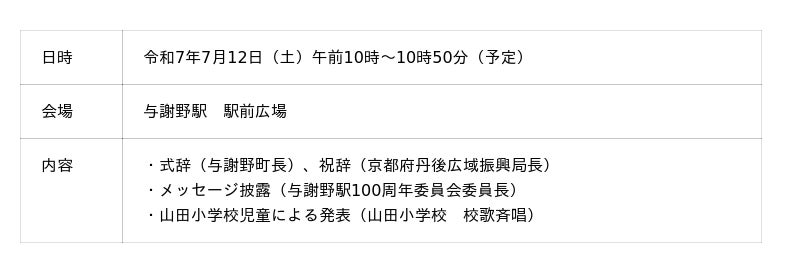 与謝野駅が、丹後山田駅として大正14年7月31日に開通式が行われてから今年で100周年を迎えるため、「与謝野駅100周年記念式典」を行います。