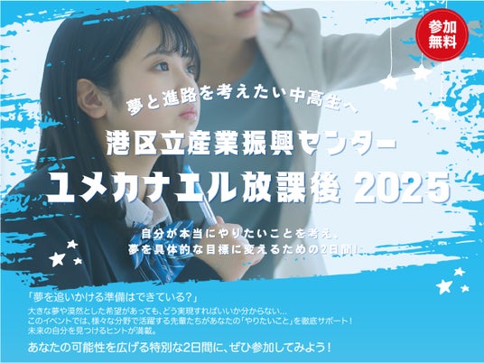 港区立産業振興センター主催のアントレプレナーシップ教育プログラムです。 普段の学校生活では接点のない大学生・社会人と話すことで、 将来の進路について多角的な視点から考え、 自分の夢を実現するための目標を考えることができます。 お子さまの可能性を広げるため、この貴重な機会をぜひご活用ください。