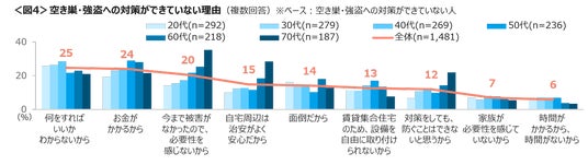 対策ができていない理由は、「何をすればいいかわからない」「お金がかかる」「今まで被害がなかったので、必要性を感じない」で20%台。狙われやすいとされる70代は「今まで被害がなかったので、必要性を感じない」「自宅周辺は治安がよく安心」「対策をしても、防ぐことはできないと思う」が他の年代に比べ目立って高い。<図4>