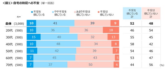 自宅の防犯への不安感は、「やや+不安を感じている」が52%、「あまり+不安は感じていない」は48%と拮抗。不安を感じている割合は、40代の58%が最も高く、20代、70代は40%台と低い。<図1>