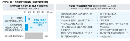 自宅で空き巣・強盗被害にあった人は5%、ご近所や家族など周囲の人が被害にあったと聞いた人は14%。具体的には、ガラスやシャッターが壊され侵入された、車、室外機、農具や米などが盗まれたという声が聞かれた。<図5>