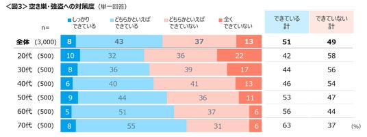 自宅での空き巣・強盗対策は「しっかり+どちらかといえばできている」は51%、対策ができている割合は、年代が上がるほど高まり、70代は63%であった。<図3>