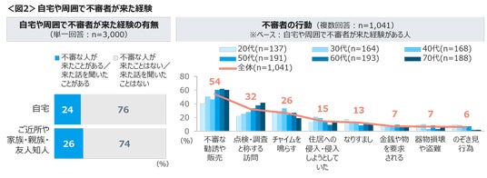 自宅に「不審な人が来たことがある」は24%、ご近所や家族など周囲から、「不審な人が来たことがあると聞いた」は26%。不審者と思われる人の行動は「不審な勧誘や販売」が54%と半数超え、「点検・調査と称する訪問」32%、「チャイムを鳴らす」26%、「住居への侵入・侵入しようとしていた」15%などがあがった。50代~70代の「不審な勧誘や販売」「点検・調査と称する訪問」は高い水準。<図2>